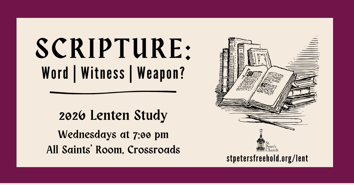 Join us in person or online in the All Saints’ Conference Room in Crossroads, Wednesdays in Lent. Participants are encouraged to attend in person if they are able. If distance or health limits travel, online participation is celebrated!.